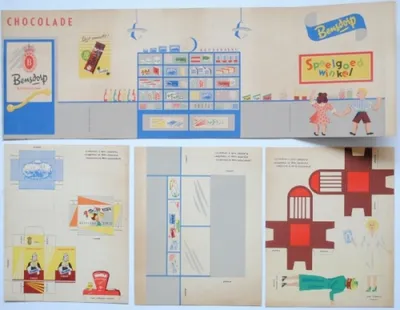 This item contains no English description. See the Dutch description: Ca. 1950, 18 x 54 cm. Nog ongebruikt, met vouwlijnen en 3 bijbeh. uitknipkaarten met invouwbare producten, mensen en inventaris.