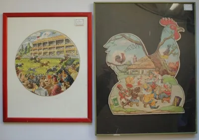 This item contains no English description. See the Dutch description: Ca. 1930. Puzzel in vorm van een haan. Compleet, gelegd, achter (plexi)glas. Achterzijde lijst de orig. verpakking....