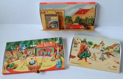 This item contains no English description. See the Dutch description: Clowns in circus, de Rattenvanger van Hamelen + Union Edel Chocolade pop-up van een autogarage. Ca. 1950.