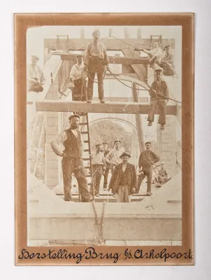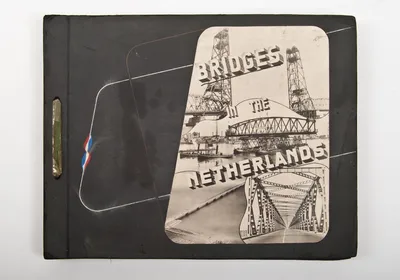 Ca. 1930. Photo album with 34 black-and-white photographs depicting the construction of 4 bridges in the Netherlands with subscript. A De brug over de Waal nabij Nijmegen. B Brug...
