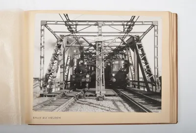 Elaborate album with 50 black-and-white photographs of stations, trains, bridges, etc. Ca. 1930. Oblong, in artificial leather binding.