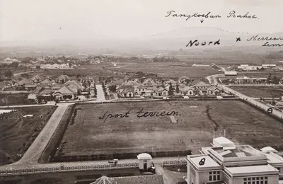 Panorama composed of 5 different images depicting a.o. het jaarbeursterrein and the Tangkoeban Prahoe in the background. Taken by professional photographer, before 1926, given...