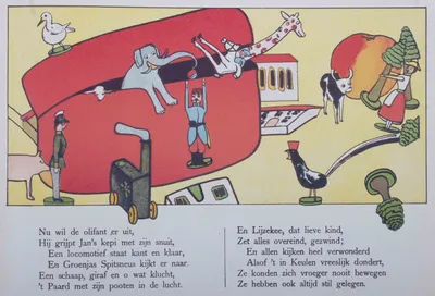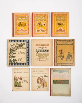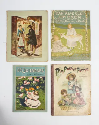 Teekeningen van Arpad Schmidhammer en versjes van Tante Ida. Jos Scholz, Mainz, ca. 1900. 20 pp. In half cloth and all p. on cardboard + Levend Speelgoed. Een grappige Droom door...