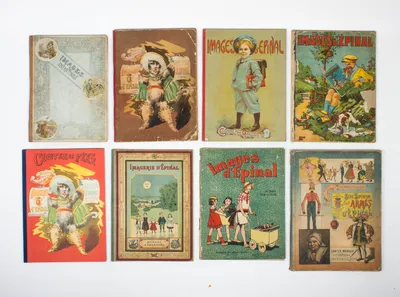 Images enfantines. Folio, in half cloth, ca. 1890. Containing ca. 100 épinal penny prints + Imagerie d'Epinal. Album d'Images Pellerin a Opinal - and 5 other albums filled with French penny prints.