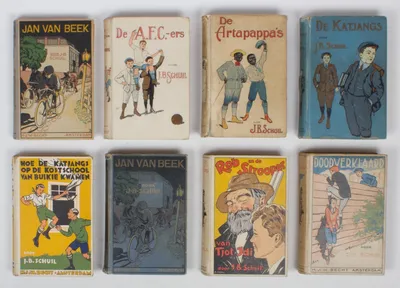 Various places and publishers (e.g. Kluitman), late 19th/20th century, 9 publications incl. 'Met de Zeemeeuw naar 't zonnige zuiden' and 'De Goudvulkaan'. Gebr. Kluitman, Alkmaar,...