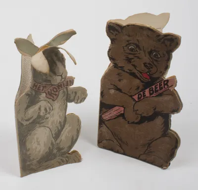 De Beer. De familie de Bruin. Publisher and writer unknown. 10 pp., ca. 1910. Book in cut-out with felt cover + De Geschiedenis van een konijntje. [idem] in the shape of a rabbit.