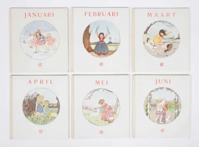 12 month books, January-December. V. Goor zonen, 's Gravenhage, 1939. Drawings and rhymes by Rie Cramer. Half cloth.