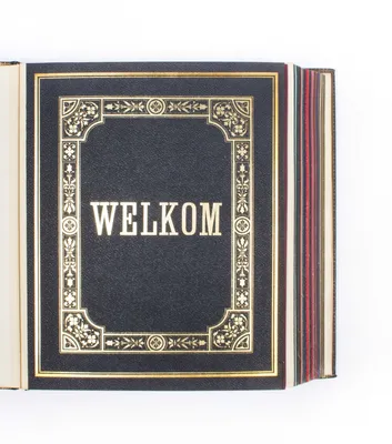 Amsterdam, 1892. 34 leather book cover samples in various colours and various titles and title scenes. 30 x 25 cm. Deluxe binding in black leather with ribbed back and gilt title.