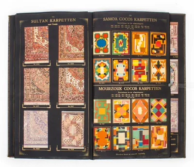Dewiho Dessins. Tapijten en Karpetten. Ca. 1915. 41 pp. Folio (55 x 33 cm.) catalogue in Art Deco. Cloth with Art Deco design and pasted front plate. Inside pasted plates of carpets...