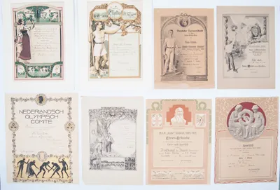 Nederlandsch Olympisch Comite. Diploma voor vaardigheid voor den Heer B. Zietse, 27 augustus 1940. Design Koninklijke Begeer, printing Versluys & Scherjon, Utrecht. 50 x 40 cm....