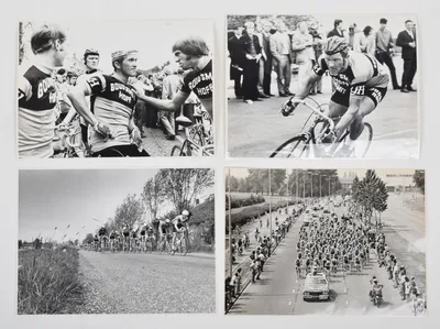 Album with 90 press photos concerning cycling, most from the '70s and '80s, stamped on reverse and often provided with some annotations and title photo. Photo size mostly 24 x 18 cm.