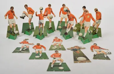 Portraits of 15 players for the Dutch national team. Cardboard figures on stands. advertisement for Crespa Chips, 1967. With Johan Cruyff, Miel Pijs, Coen Moulijn, Theo Pahlplatz,...