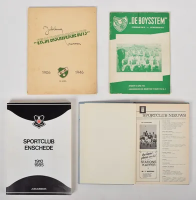 Jubileum nummer E.V.C. de Enschedesche Boys 1906-1946. 54 pp. + Sportclub nieuws. Officieel maandorgaan van Sportclub Enschede. 45e jaargang, 1965/66. Bound - and 2 more.