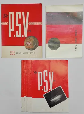 P.S.V. 1913-1963. 72 pp. + De P.S.Ver Jubileum Uitgave 1913-1953. 64 pp. Sewn - and 7 club magazines between 1967 and 1971.