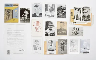 Lot with 40 cyclist picture postcards, approx. half of which signed by the cyclist himself. Signature i.a. Wim van Est, Rik van Looy, Jan Jansen and Peter Post. Added an open letter...