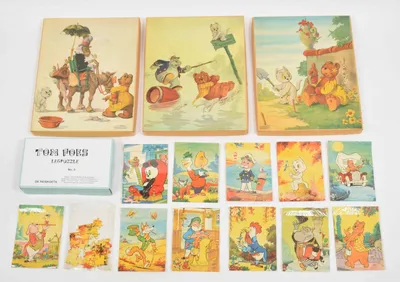Complete set of 12 Luteijn Bim Bam Bom Puzzels + De Reiskoets Gustav Czopp, Amsterdam, 1941. Only front board of the box and the puzzle + series of jigsaw puzzles in box, variant...
