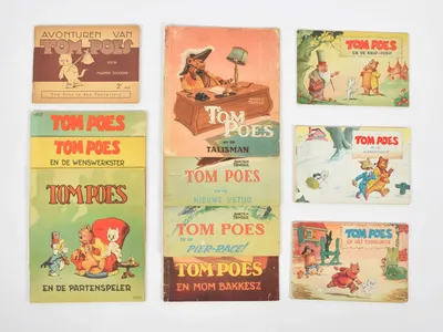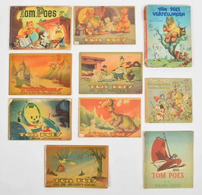 Album containing all 48 Tom Puss cards published by De Muinck & Co, Amsterdam, 1941-'43. With the original wraps of De Toovertuin, Reuzenvogel and Vreemde Uitvinding - added: 8...
