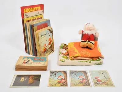 Lot with Paulus the woodgnome publications and curios with Stripkalender 1976, picture postcards Paulus, Getekend en verteld door Jean Dulieu. Amsterdam, N.V. de Arbeiderspers,...