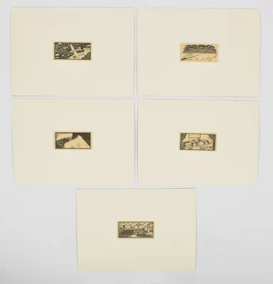 Lot with 5 woodcuts by Hergé. Scenes depicted: 1) Airplane above jungle (Cigars of the Pharaoh); 2) Ship on the horizon (The Red Sea Sharks); 3) Harbour view (Red Rackham's Treasure);...