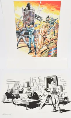 Screen print Modesty Blaise & Rip Kirby. Edition hc 6/25, signed in pencil by Romero and Peter O'Donnell. 50 x 60 cm. + Axa & Modesty Blaise. Signed by Romero and Peter O'Donnell....