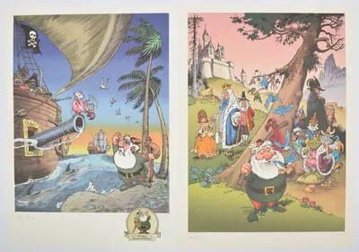 Two prints issued in limited edition with the deluxe clothbacked bound edition. Scene "Douwe Dabbert en de Verwende Prinses". No. 49 of 100 copies, and: "De Weg naar West". No....