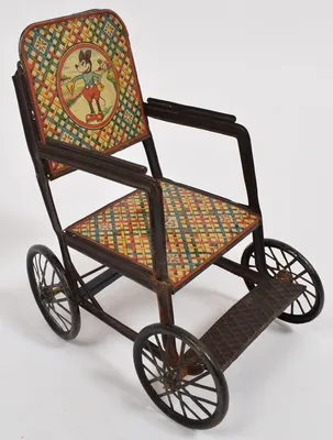 La Isla Stroller, Rogelio Sanchiz, La Isla, RSA, c. 1928. Tin doll cart with rat-like drawing of Mickey Mouse, 19 x 17 x 12 cm.
