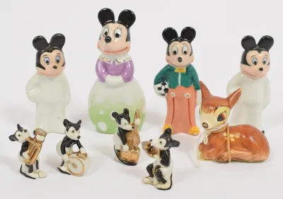 Rare porcelain brass band Mickey Mouse. Bassist, Tuba-player, Horn-player and Drummer, '30s. Height each 4 cm. Unclearly signed + 4 Mickey/ Minnie figures and a Bambi, '50s/'60s.