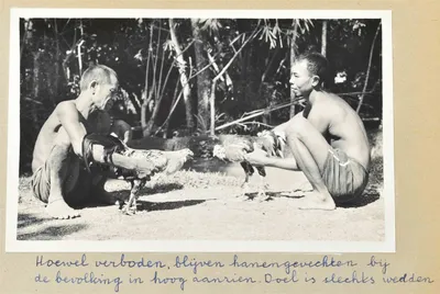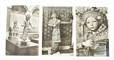of photographs and picture postcards of Bali. Ca. 1955. W. images of a.o.: people performing traditional dances, a marriage, people bringing temple offerings, people farming rice...