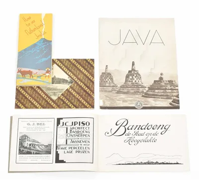 Ca. 1900-1940, incl. 30 picture postcards depicting works of art, views (a.o. Soerabaja and Java Hotel) and "Moluksche Zeetuin"), a series of 9 chromolithogr. advertorial cards...