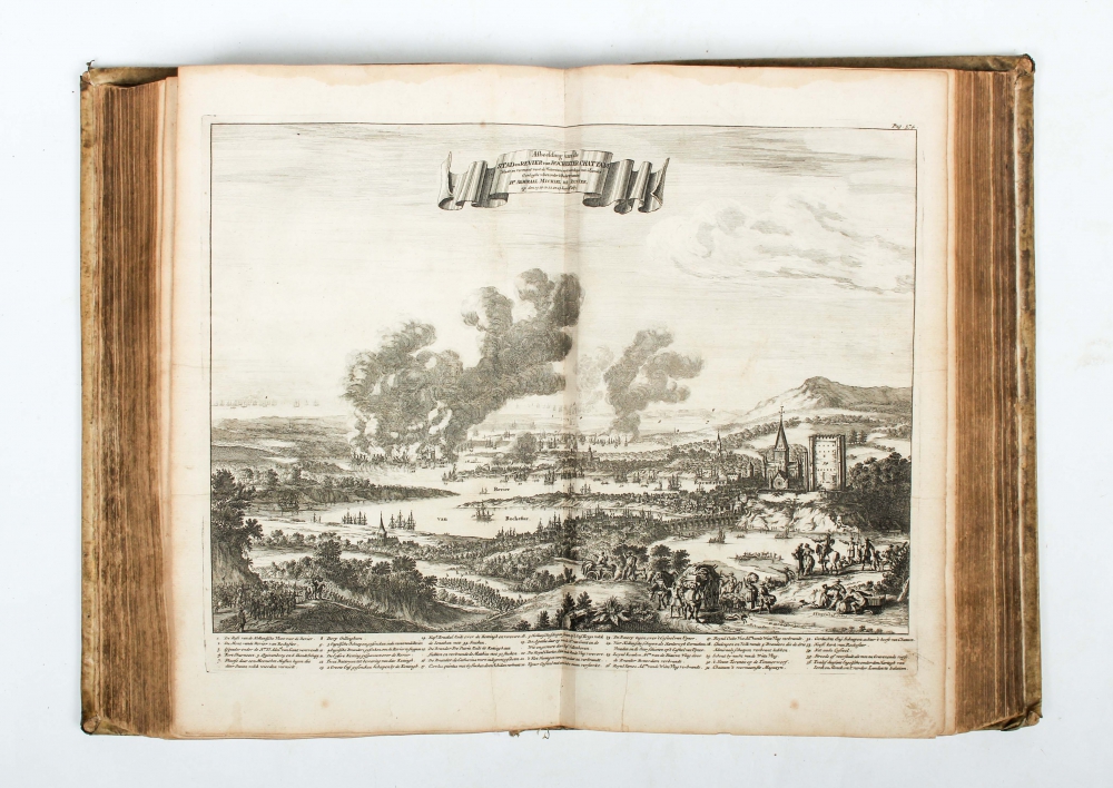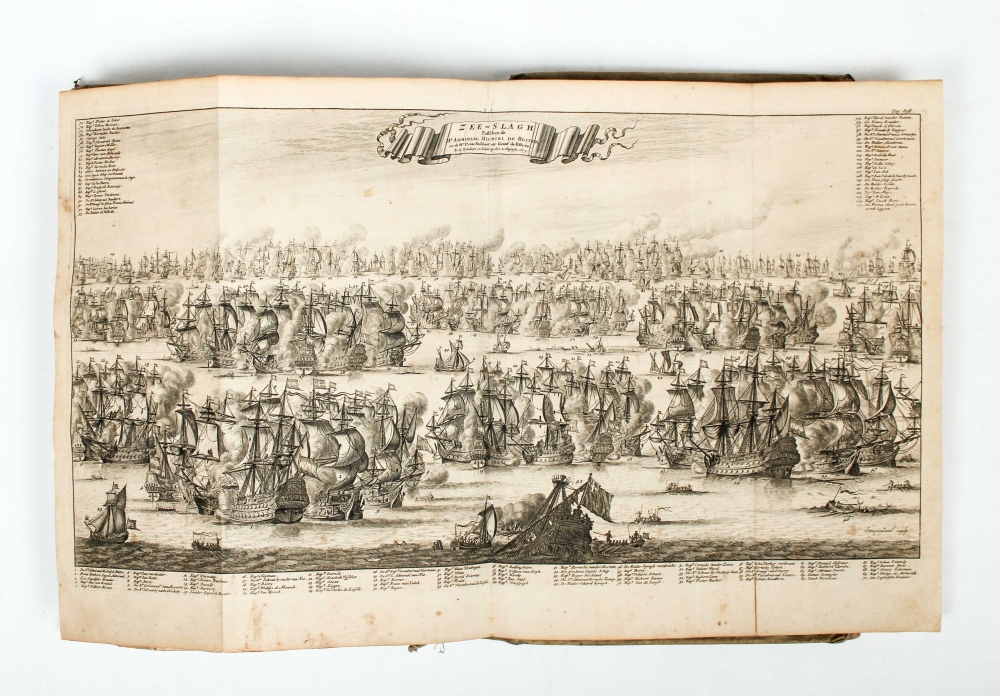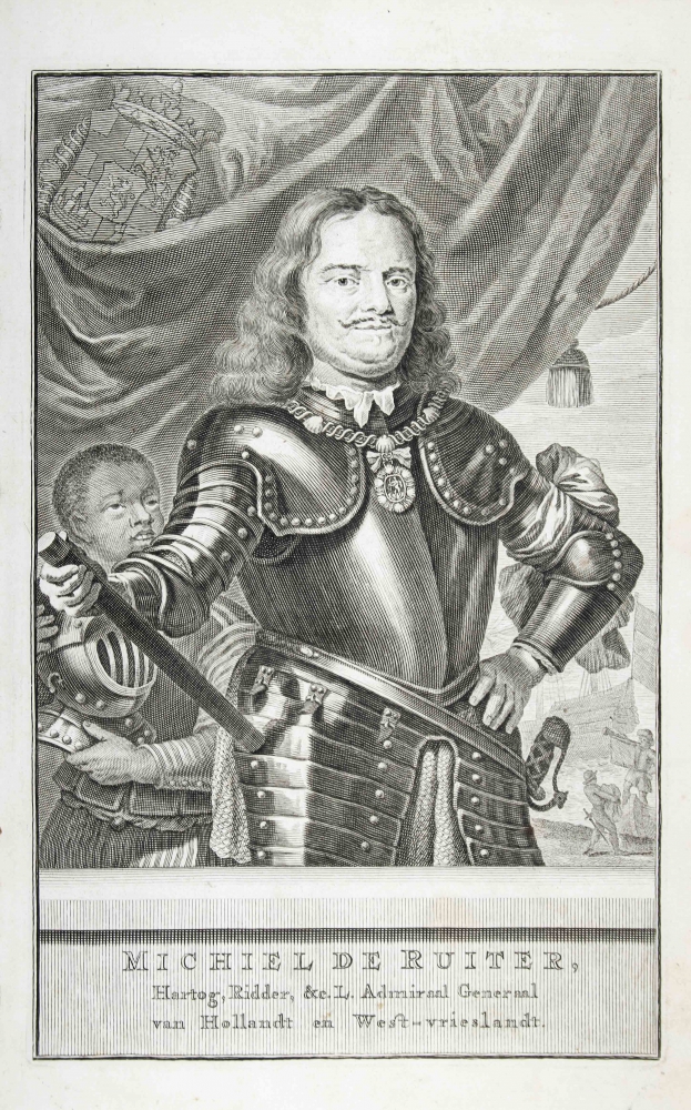Hertog, Ridder, &c. L. Admiraal Generaal van Hollandt en Westvrieslandt. Beschreeven door Gerard Brandt. Met schoone koopere plaaten verciert. Amsterdam, for Wolfgang, Waasberge, Boom, Van Someren & Goethals, 1691, (12),1065,(23) p., with the following copperplates: frontispiece, portrait, tomb by J. Mulder and 7 double-page plates by B. Stoopendael (mostly sea battles, incl. the folding profile), contemporary blindstamped vellum, folio.