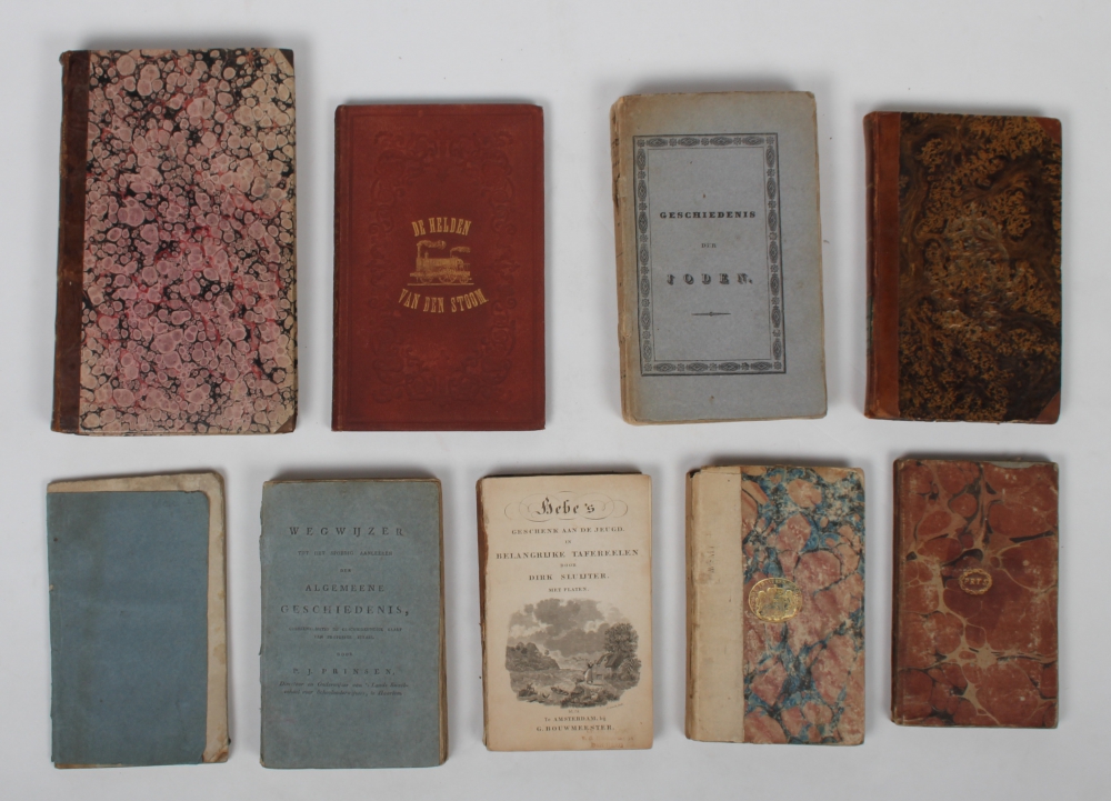 Nut en verpoozing, in merkwaardige gebeurtenissen van vroegeren en lateren tijd. Dirk Sluijter. Amsterdam. Schalekamp, Van de Grampel, Bakker. Ca. 1840. Prize binding Stads Tusschen Scholen, Amsterdam. Uitgelezene verhalen voor jonge lieden. Amsterdam. Weytingh & Van der Haart. 1839. Prize binding Middelburg, and 5 more (total 9).