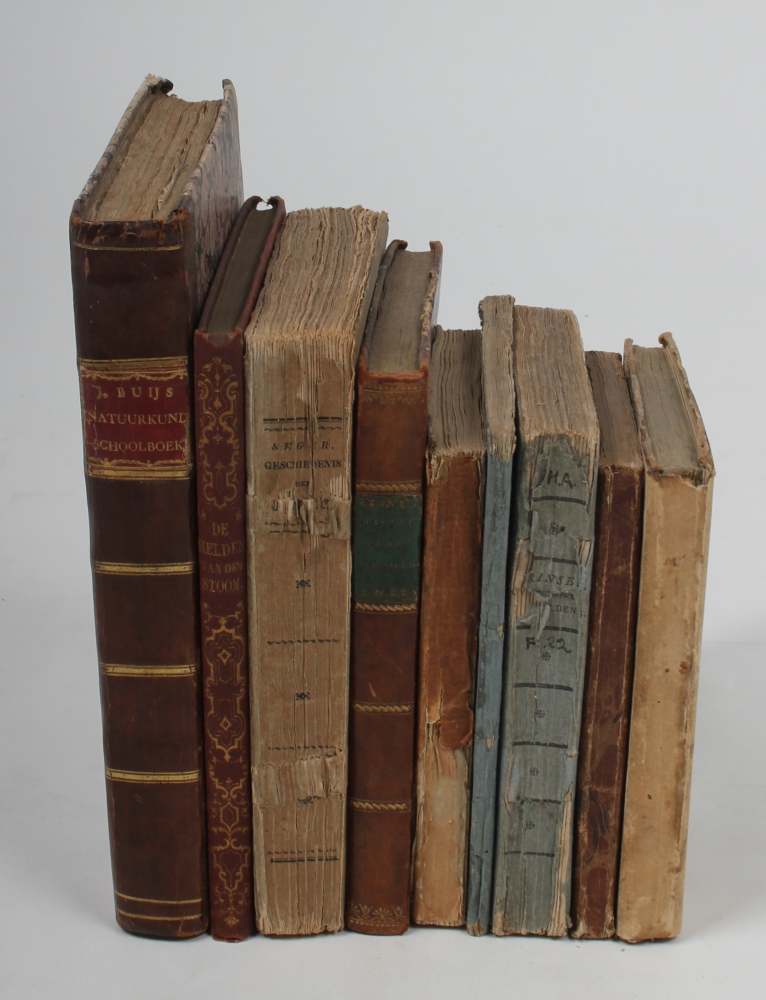 Natuurkundig schoolboek. Maatschappij tot Nut van 't Algemeen. Leiden, Deventer, Utrecht. Mortier, De Lange, Van Paddenburg. 1800, 8vo, 4 parts in one volume, complete with 15 folding copperplates. Combined with: Natuurkundig schoolboek. Maatschappij tot Nut van 't Algemeen. Leiden, Deventer, Groningen. Mortier, De Lange, Oomkens, 1809. Prize binding, small 8vo, complete with 4 folding copperplates.