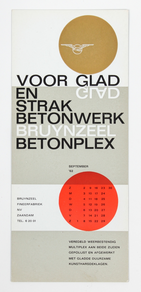 "Bruynzeel 40 mm. balkon-en tuindeuren". August 1962 + "Voor glad en strak betonwerk Bruynzeel betonplex". September 1962 + "Basralocus profielschroten". October 1962 + "Bruynzeel Vloerenfabriek NV Zaandam". November 1962.