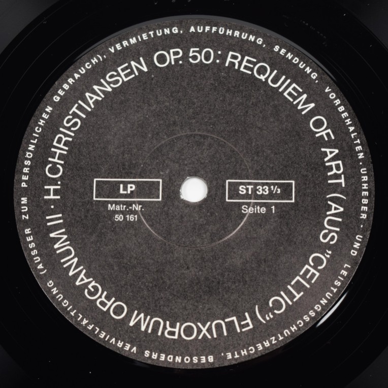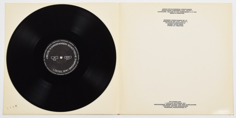 Schottische Symphonie Requiem of Art. Aufnahme: College of Art, Edinburgh 21.8.1970. Mono 44 Minuten/Henning Christiansen Op. 50 Requiem of Art (Aus "Celtic") (Fluxorum Organum II). Sound: Peter Sakse Stereo 36,5 Minuten. Bernd Klüser und Jörg Schellmann. 1e ed., 500 ex., Schellmann, München, 1973. Hand stamped "116" on inside gatefold sleeve.