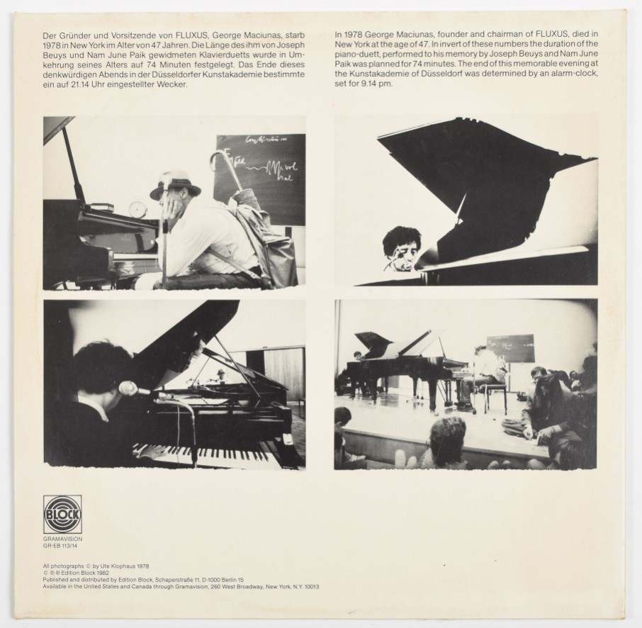 Klavierduett. In memoriam George Mariunas. Fluxus-Soirée der Galerie René Blok in der Aula der Staatlichen Kunstakademie Düsseldorf. Freitag, 7 Juli 1978. Foldout sleeve. Block Gramavision GR-EB 113/114, Berlin, 1982.