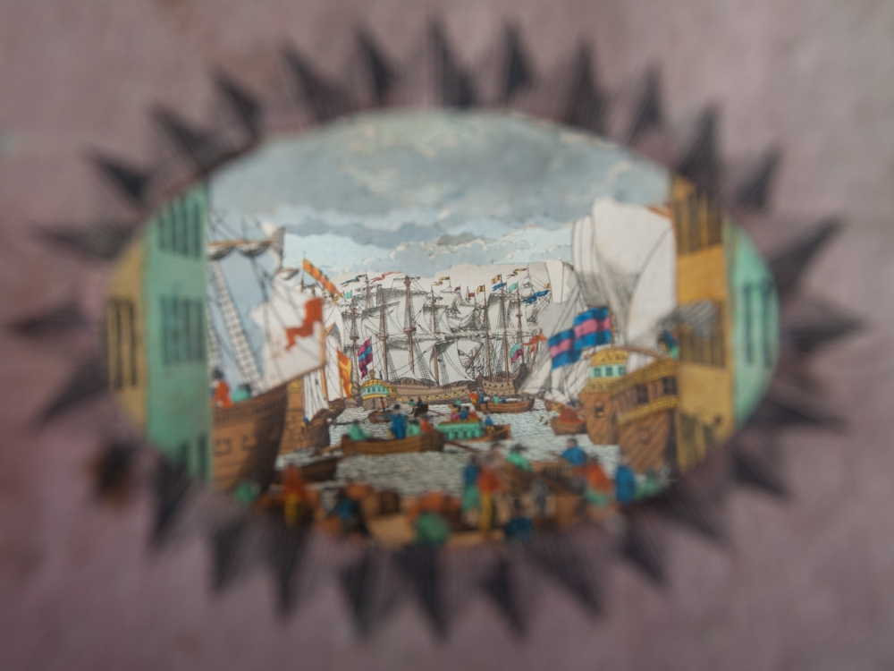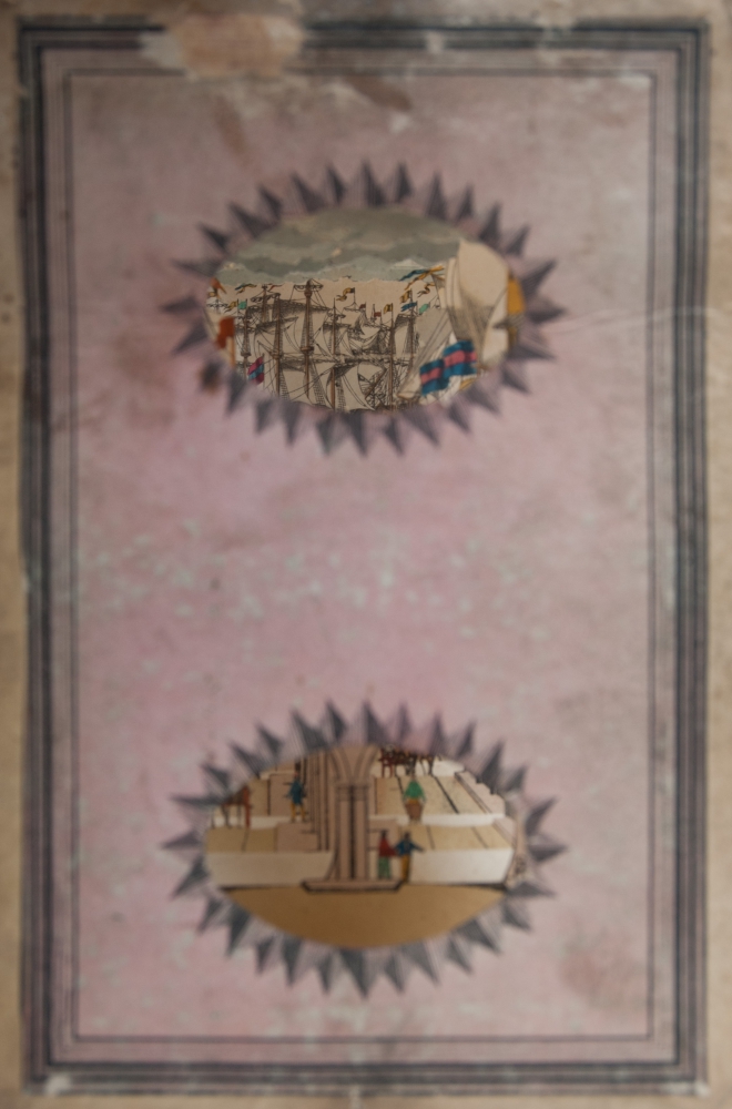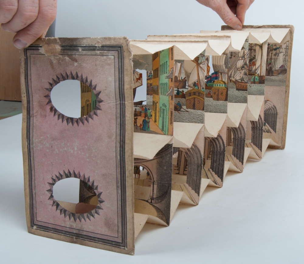 Perspectivische Ansicht des Tunnels unter der Themse/Vue perspective du Tunnel sous la Tamise. Colourlithographic peepshow interior, no date or place, ca. 1850. Consists of 6 sections of 22 x 14.5 cm., each with scene top and bottom, connected via thin paper segments, extendable in the manner of an accordeon up to a depth of ca. 57 cm., as published in the original marbled slipcase with title vignette in German and French. 23.5 x 16 x 10 cm.