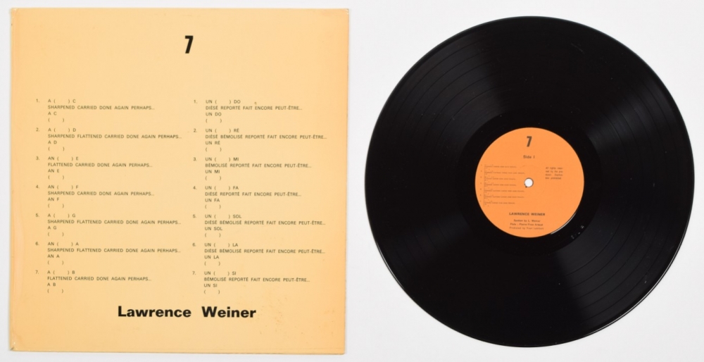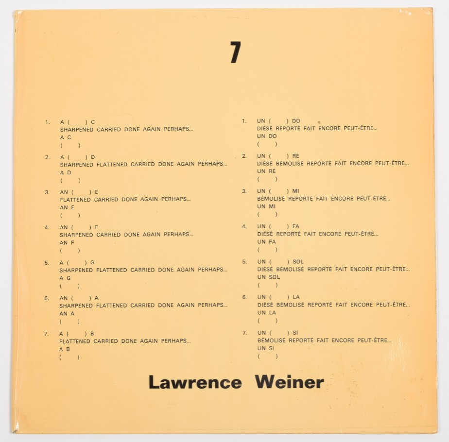 7. Side I. spoken by Lawrence Weiner; Side II spoken By Bétrice Conrad-Eybesfeld (translator). Flute Pierre-Yves Artaud. Prod. Yvon Lambert.