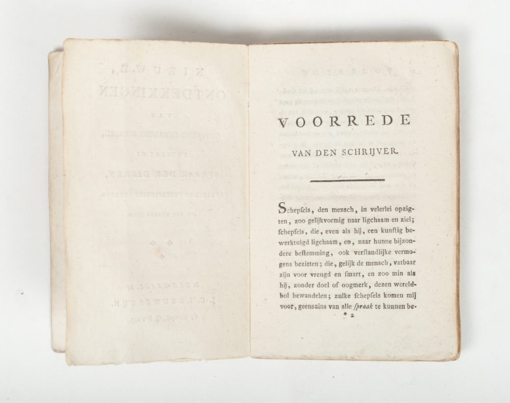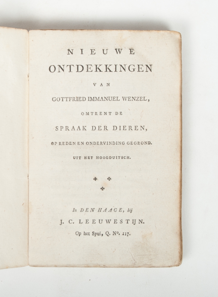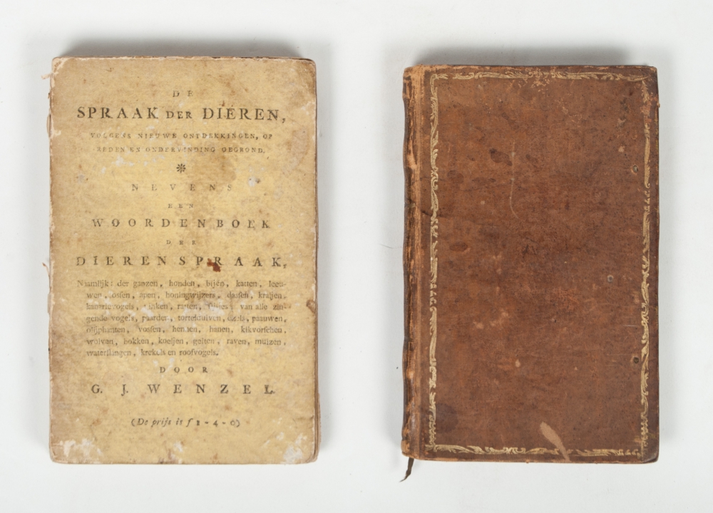 (1) Nieuwe ontdekkingen van Gottfried Immanuel Wenzel, omtrent de spraak der dieren, op reden en ondervinding gegrond. (Nevens een woordenboek der dierenspraak (...)) (title on front board). Uit het Hoogduitsch. The Hague, J.C. Leeuwestijn, n.d. (1802), XVI,196 p., original printed cardboard, small 8vo.