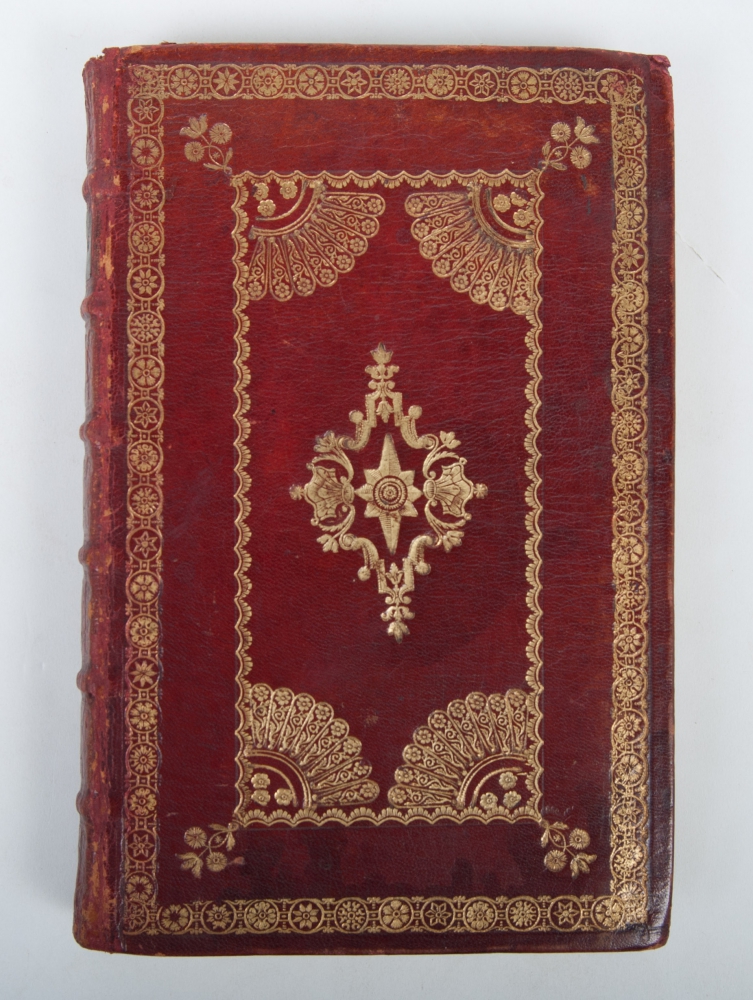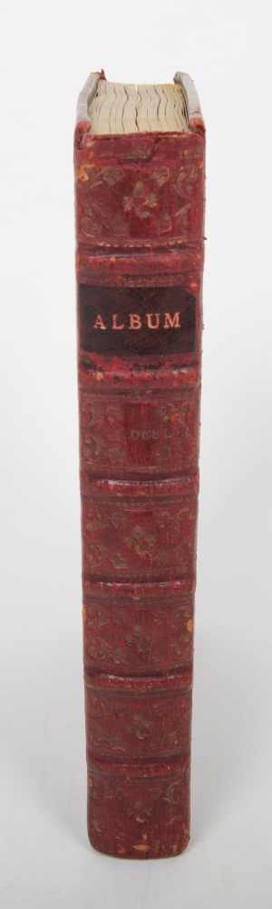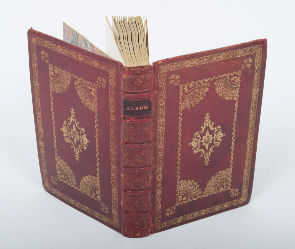 Album with ca. 140 blank leaves. 19th century. 8vo, red morocco, spine with print Album with black and gilt stamping, both boards with double embroidery, centered decorated corners and central ornament with floral and geometrical motif, marbled endpapers, yellow edges, ex libris of John Landwehr. Spine with light traces of use, else a lovely copy.