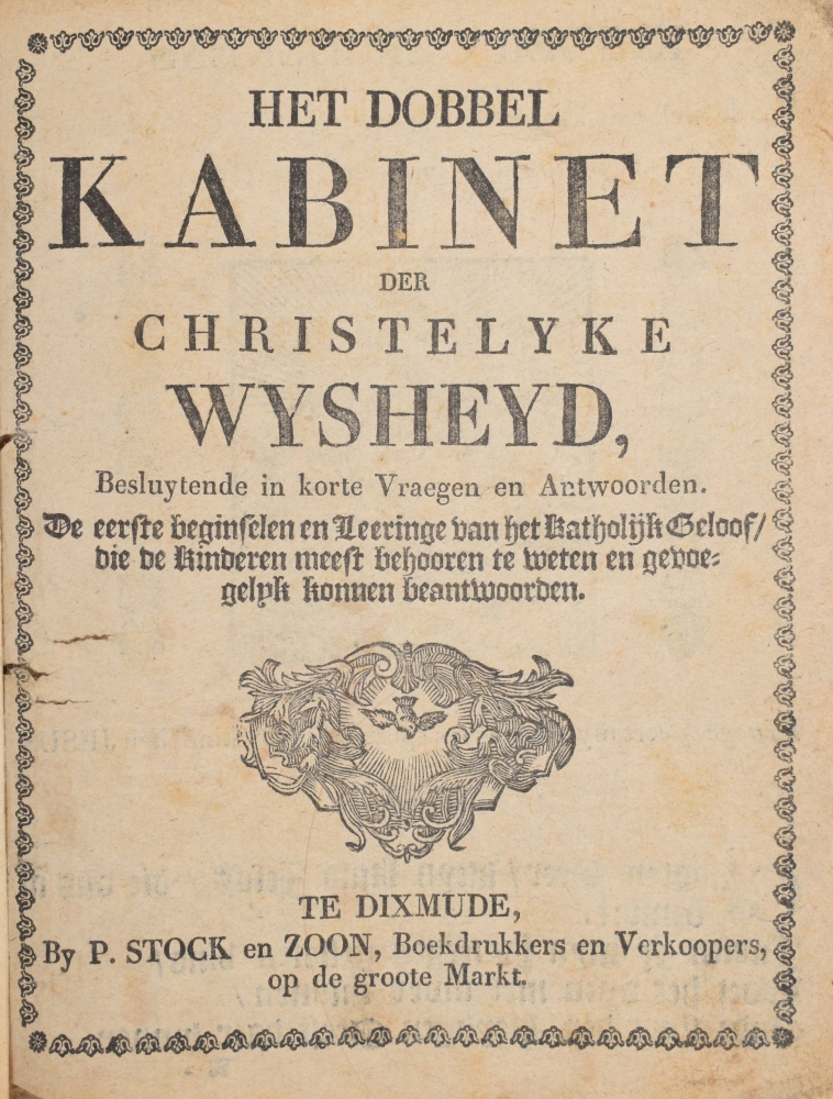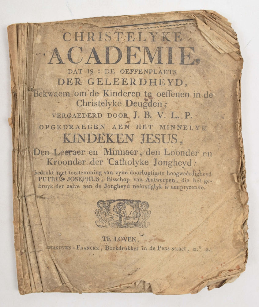J.B. v.[an] L.[okeren], De kleine christelyke academie, dat is: de oefenplaats der geleerdheid. Bekwaam om de kinderen te oefenen in de christelyke deugden (...). Loven, Gutskoven-Francks, [ca. 1790], 4to, paper without wrapper, 59 pp., printed in 2 columns.- (wrinkled); [Francisus van Thienen], De historie van den conincklijcken propheet David (...). Antwerp, weduwe H. Verdussen, [circa 1760], paper wrapper, 4to, 64 pp., printed in 2 columns, engraved title, contemporary owner's inscription inside wrapper. - (wrinkled); De schoone historie van den vromen en godvruchtigen jongeling Joseph (...). Gend, B. Poelman, [ca. 1760], 4to, paper wrapper, engraved title, 56 pp., printed in 2 columns. -(wrinkled, wrapper loose, lacks back cover); Het dobbel kabinet der Christelijke wijsheid (...). Dixmude, Stock & zn., [ca. 1790], 4to, later cardboard wrapper, unpaginated, with many engravings and vignettes. - (wrinkled).