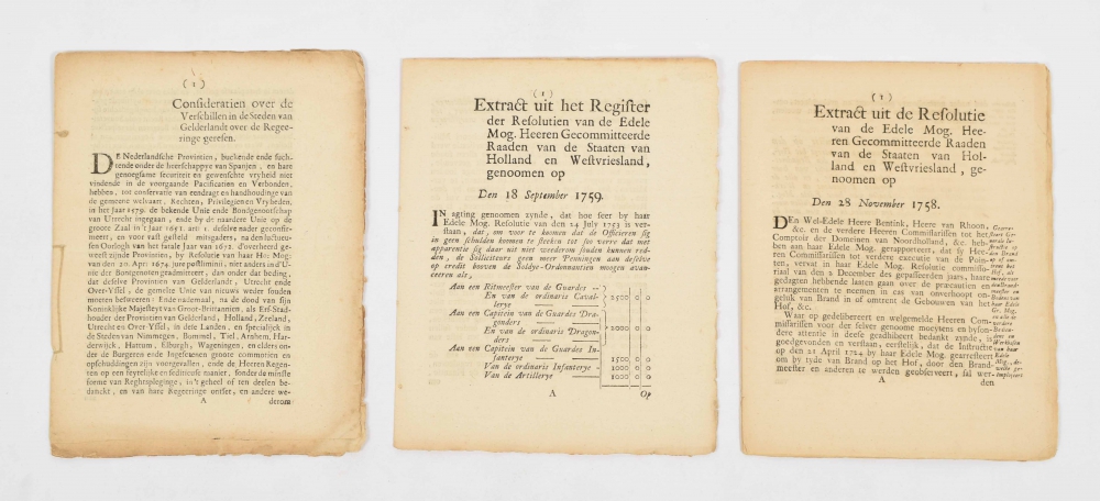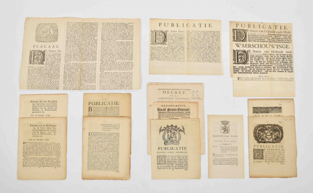Contains e.g. "Ordonnantie vande Staten Generael, Inhoudende sekere penen op impositie, tot laste vanden geene die eenige ongefondeerde Processen institueren (...)" (The Hague, 17th-century, only one copy in PiCarta), several concerning Gelderland (one on cloth merchants), one publication concerning Nijmegen and a ban on fishing from 15 March to 15 May due to spawning season (1707). The most extensive extract (22 p., 1758) concerns projected precautions "in cas van onverhoopt ongeluk van Brand in of omtrent de Gebouwen van het Hof, &c.", the placard in plano (1745) concerns a "Continuatie van de Precautien tegens den invoer van Goederen uijt Marocco in Barbarij" (title in old handwriting on reverse). (total 14)