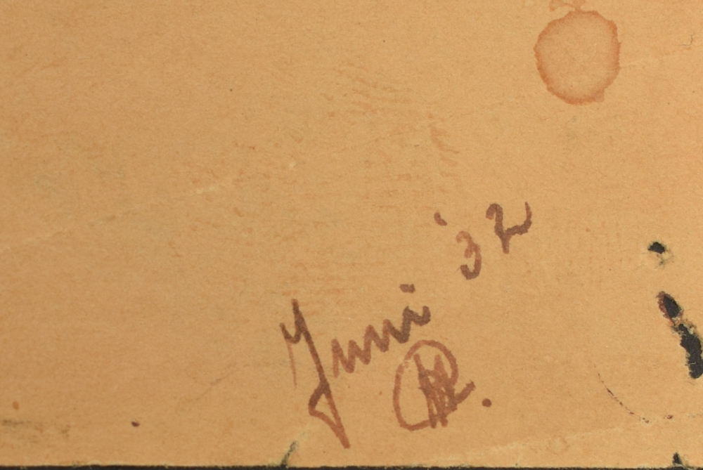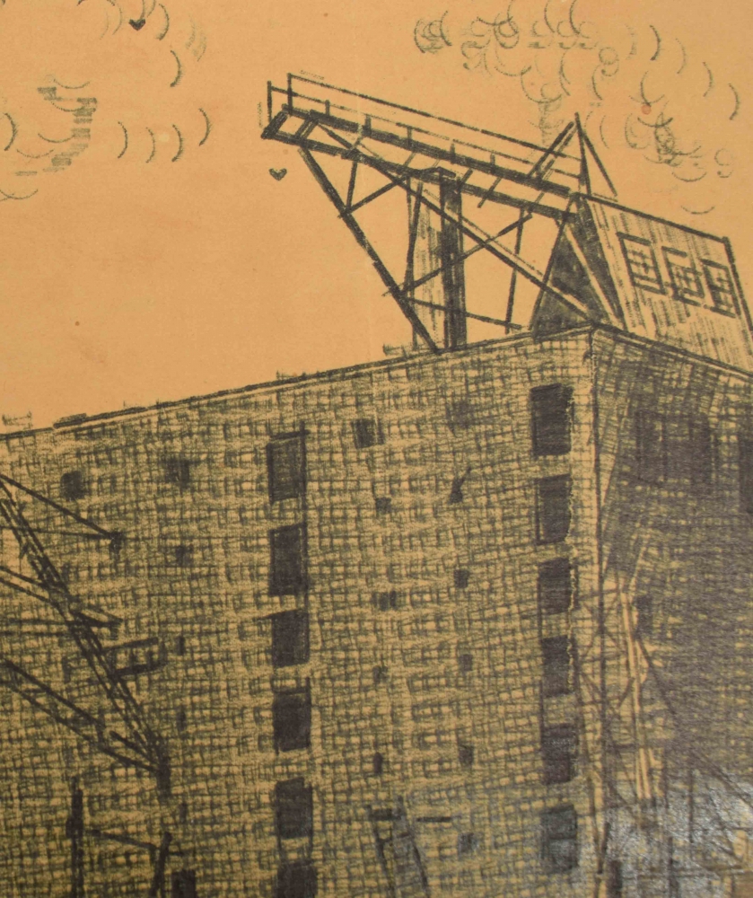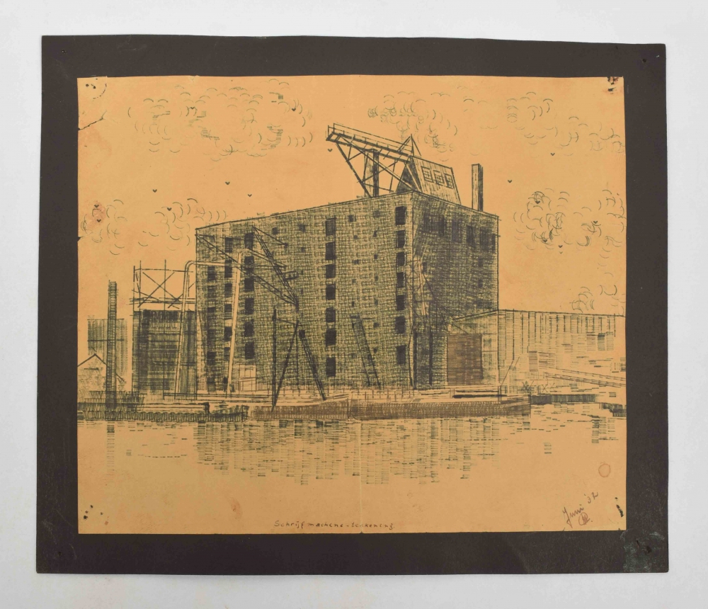 View of factory buildings near a quay entirely produced by typewriter, titled, monogrammed and dated "Juni '32" in pen, 16 x 19 cm. (mounted and with thumbtack holes in corners).