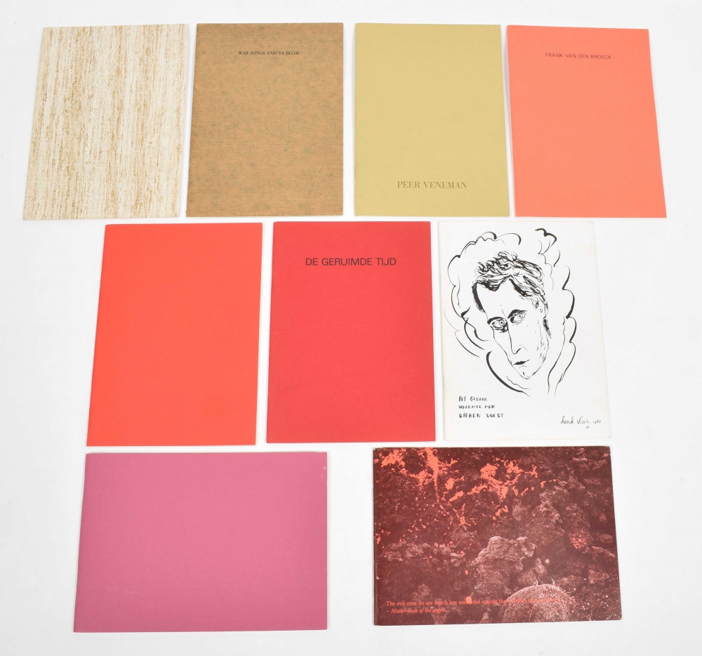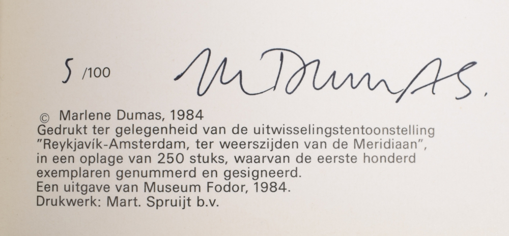 1984. Published for the exchange exhibition "Reykvavik-Amsterdam, ter weerszijden van de Meridiaan". Edition of 250, first 100 numbered and signed. This is no. 5. Artists concerned are Erik Andriesse, Marlene Dumas, Frank van den Broeck, Peer Veneman, Henk Visch, Jean Paul Franssens, Rene Daniels, Ansuya Blom and Martin van Vreden.