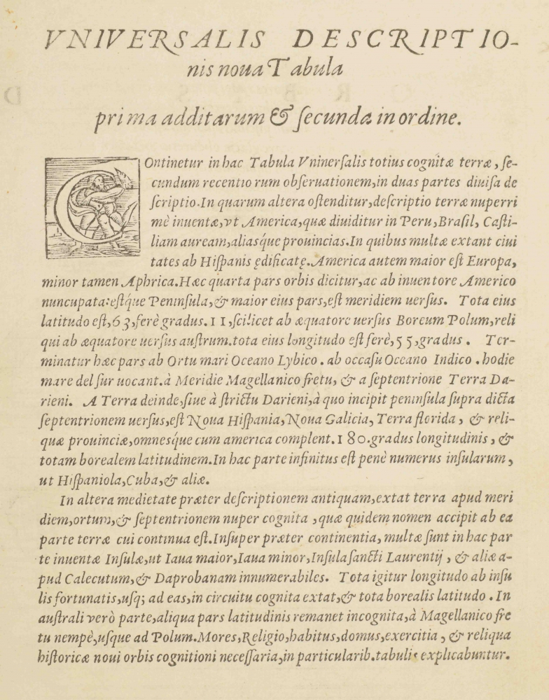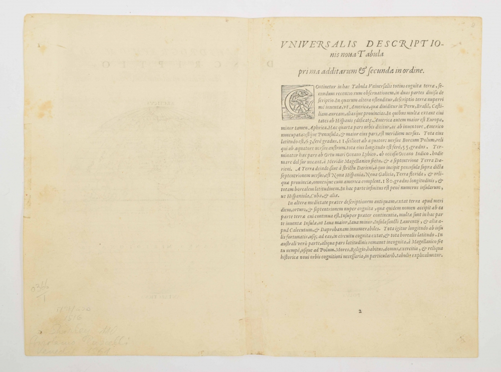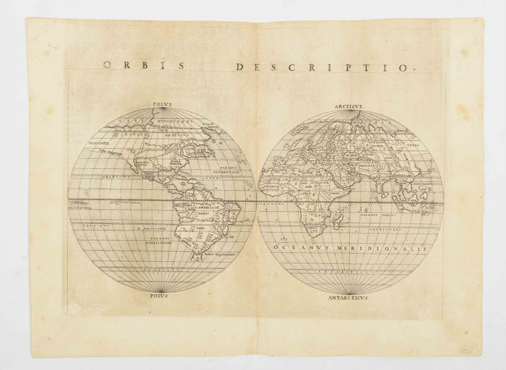Engraved map by Ruscelli, c. 1561, 18.5 x 25.5 cm. (engraved part, leaf 23 x 30.5 cm.), with Latin text "Universalis descriptionis nova Tabula" and paginated "2" on the reverse of the sphere with both Americas (other half blank).