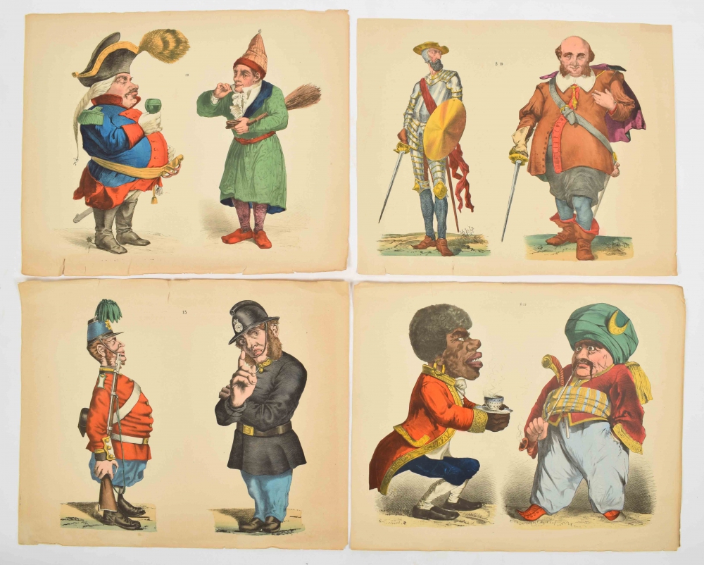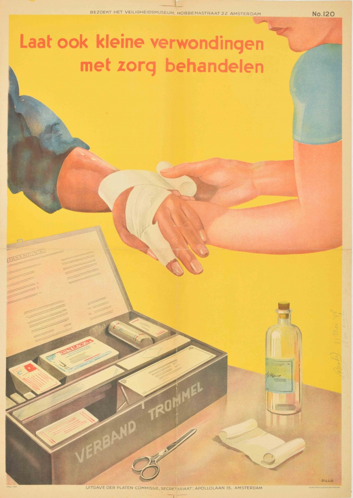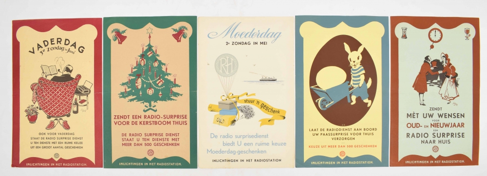 Albert Klijn: Getuigschrift gemeente Amsterdam, 1936. Addressed to H.G.C. Haavekost for 25 years of service with the city. 49 x 32.5 cm. On cardboard. Some dampstaining + set of 14 caricatures on 6 leaves, c. 1870. Incl. a black servant, Arab, rabbit as the hunter and Don Quichot. Each leaf 40 x 50 cm. + poster Veiligheidsmuseum, Amsterdam. "Laat ook kleine verwondingen met zorg behandelen". Design Dillo, Kunstdruk Luii & Co, Amsterdam, 1948. 50 x 70 cm. - and 5 small-size posters for Father's Day and Mother's Day, Radio Surprise dienst, c. 1950. Design Joop de Bruyn and Jan Lutz. Each 40 x 25 cm.
