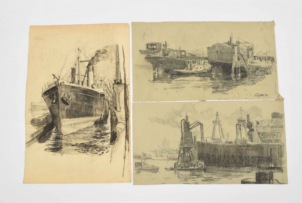 Minor tears, folds in corners. Work by a young Brinks, which already clearly shows his talent. From 1924 to 1928 Brinks studied at the Rijksinstituut tot Opleiding van Tekenleraren te Amsterdam (the RKD lists 1925-1991 as active period). This ship portrait was therefore undoubtedly produced in the Amsterdam harbour; (2-3) G. de Wit (20th cent.). (Ships in the harbour). Two drawings, both 27 x ± 50 cm., one signed "G. deWit" and dated '57 (traces of mounting). (total 3)
