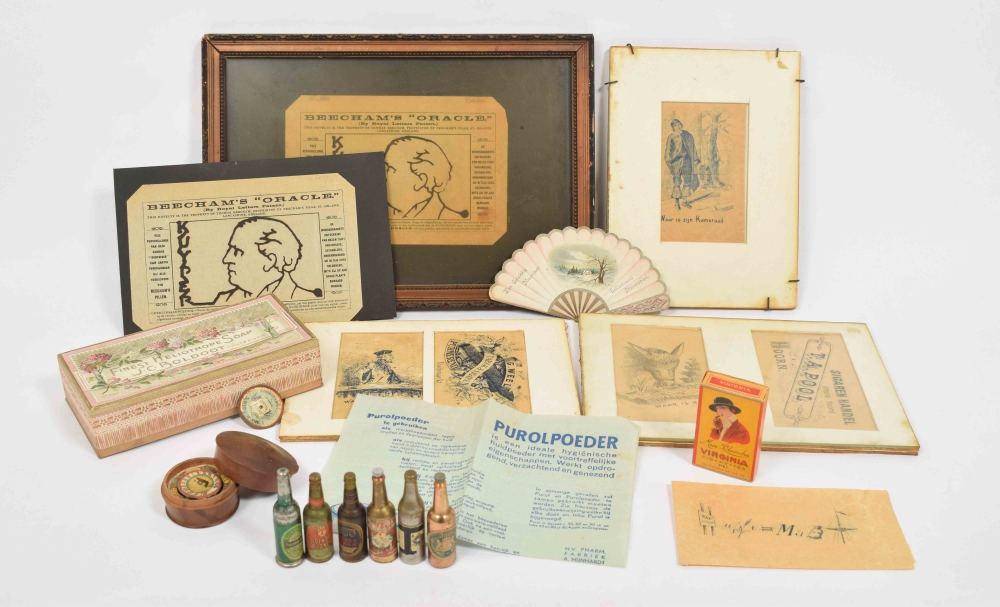 Golden Tree Pilsner + Heineken Pilsner and another 4 lighters in the shape of beer bottles, c. 1935 + Beecham's Oracle, Beecham's Pillen (2x)* + a riddle on a tobacco wrap, c. 1910 - and 3 pieces of tobacco advertising + pack of Virginia Cigarettes no 1, Miss Blanche + paper fan Geïllustreerd Stuiversblad, 1891 with calendar on reverse + token Broodfabriek Wed. J. de Jonge + cardboard box J.C. Boldoot, Amsterdam, c. 1901. Added a paper compass in wooden box, c. 1920.
