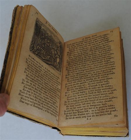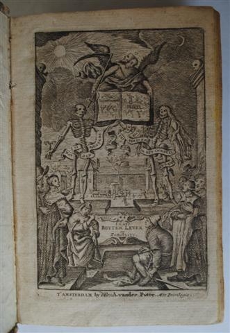 See the Dutch description: Ouderdom, Buyten leven, en Hof gedachten. Op Nieuws vermeerderd met des Auteurs Tachtig Jarig Leven en Bedenkingen op Zorgvliet. [12], 246, 94,82, 86, 32, 204, 46 p. Met gegrav. titelpagina's, uitsl. platen en grav. binnen de tekst. Gemarmerd karton.