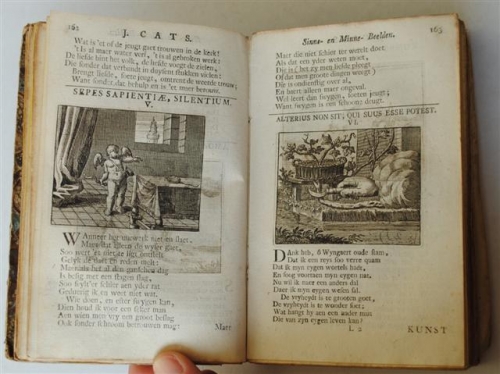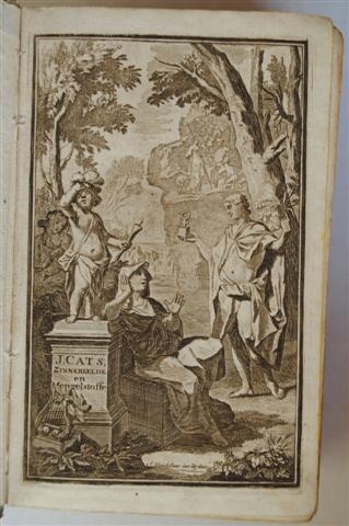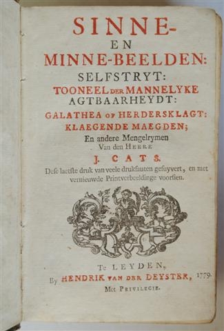 See the Dutch description: Sinne- en minne-beelden: Selfstryt: Tooneel der Mannelyke Agtbaarheydt: Galathea of Herdersklagt: Klaegende Maegden; En andere Mengelrynen van den Heere -. Leyden, Hendrik van der Deyster, 1779. [22], 218, [50], 112, [14], 55, [15], 192 p. 1 pag. los. Met gegrav. titelpagina's en grav. binnen de tekst. Gemarmerd karton.
