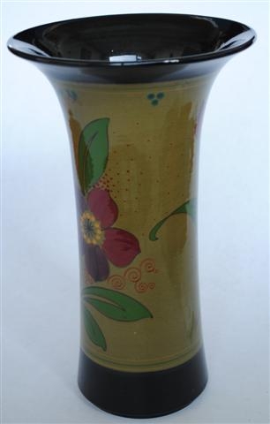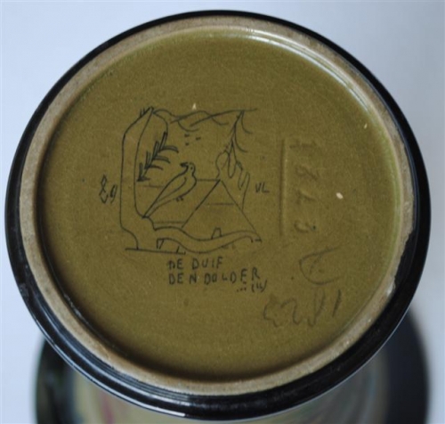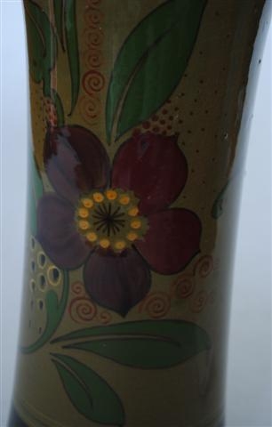 This item contains no English description. See the Dutch description: Glansplatelen vaas met bloemdecoratie gemaakt voor de Zeepfabriek 'de Duif den Dolder'. Hoogte 31 cm.